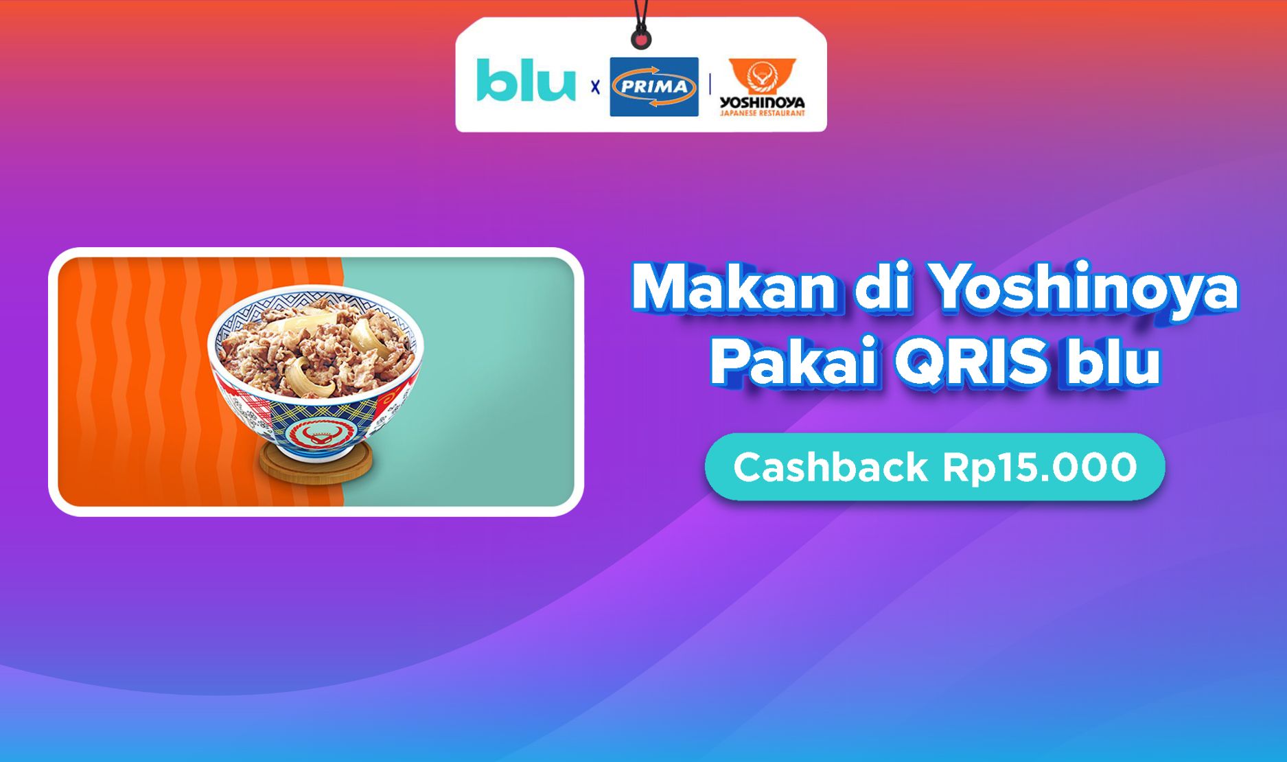 - Setiap pengguna blu yang melakukan transaksi pembelian produk apapun yang tersedia di outlet Yoshinoya menggunakan metode pembayaran QRIS blu berhak mendapatkan cashback Rp 15.000 dengan minimum pembelian Rp 100.000