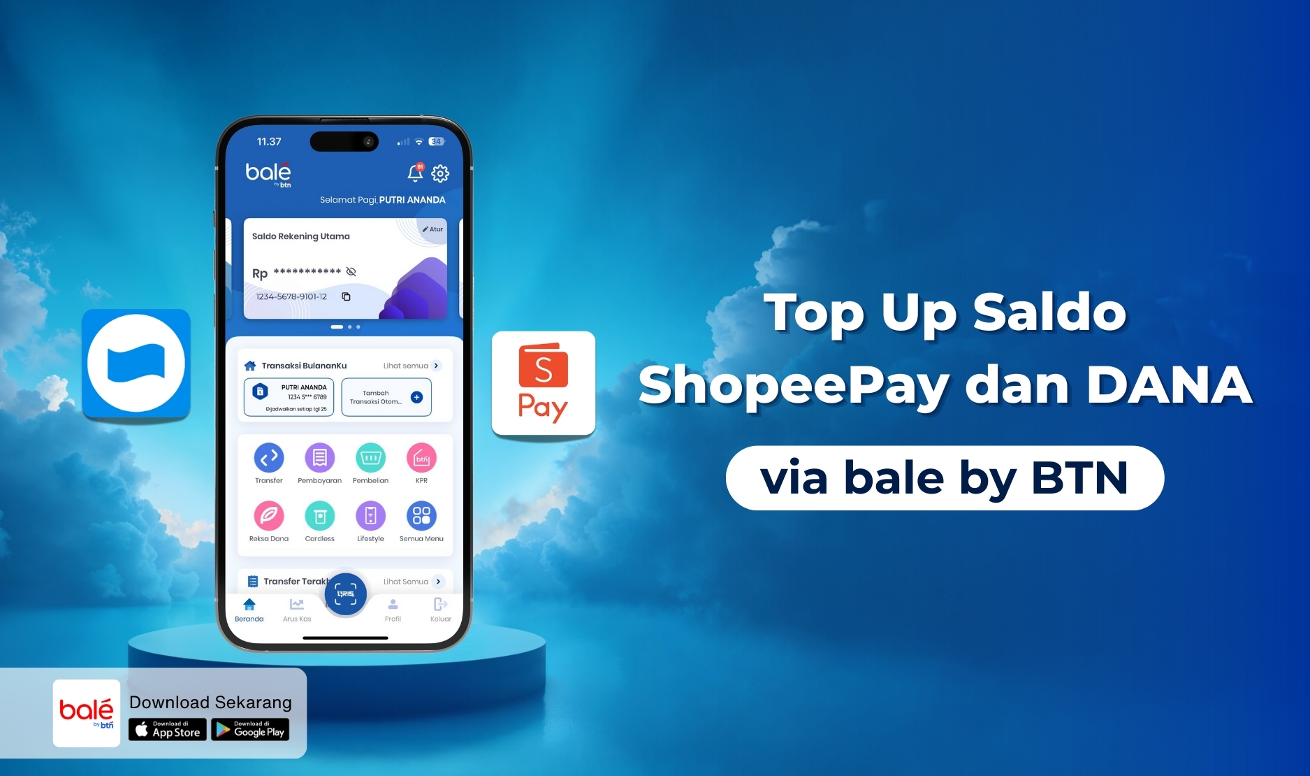 Kawan PRIMA, kebutuhan transaksi digital yang serba cepat membuat masyarakat semakin mengandalkan dompet digital seperti ShopeePay dan DANA. Kedua platform ini menjadi pilihan yang dapat dimanfaatkan untuk berbelanja online, membayar layanan transportasi, membeli makanan, hingga kebutuhan harian lainnya. Melihat kebutuhan tersebut, Bale by BTN hadir memberikan solusi yang lebih praktis dan efisien.